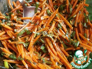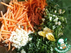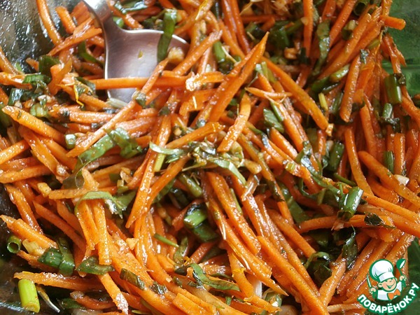 Затем промыть и очистить морковь, натереть на терке для корейской моркови с использованием насадки для средней шинковки (или порезать ножом). Добавить шинкованную зелень, масло, сладкую паприку, чили, масло, соевый соус, рубленый чеснок, свежевыжатый сок апельсина и лимона.