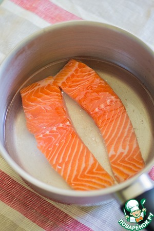 • Поместить лосось в глубокое блюдо и залить рассолом. Он должен полностью покрывать рыбу. Оставить в холодильнике минимум на полчаса, а можно оставить и на ночь.