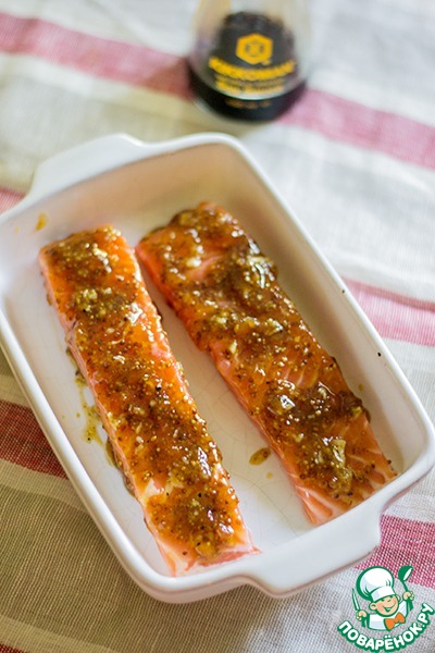 • Тщательно смешать глазурь и щедро намазать рыбу.