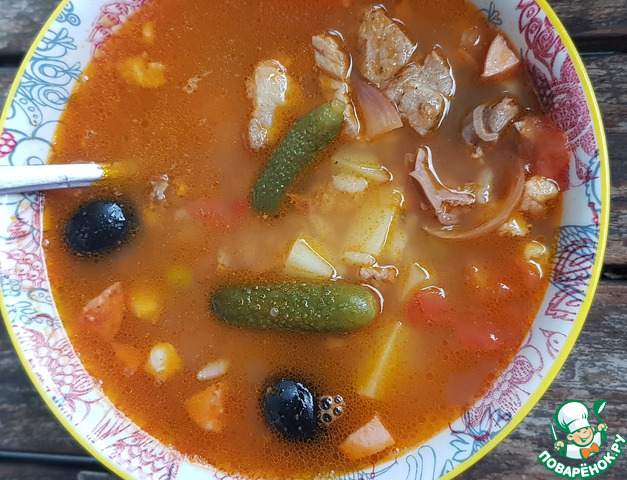Рецепт мой, не классический. Насколько я понимаю, солянка готовится по принципу пиццы - "Что завалялось в холодильнике - в дело".