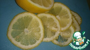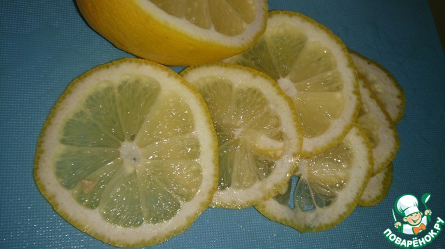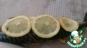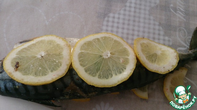 Выложить лимонные дольки слоем на пергаментную бумагу, поверх выложить рыбу, а затем снова слой лимона.