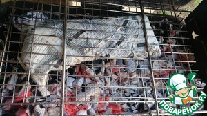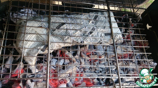 Обжарить на горячих углях, с двух сторон. Если газета сильно потемнеет ее можно снять, и при необходимости дожарить в пергаменте.