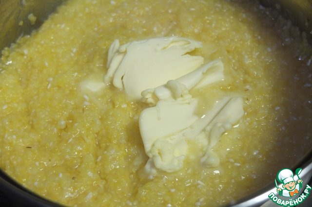 Крупу заливаем водой и ставим варить. Я варила примерно 25- 30 минут. Получается густая кукурузная каша. Добавляем сливочное масло.