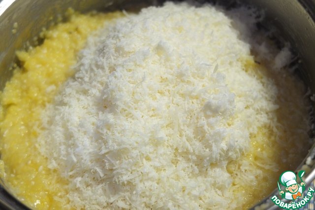 • Снимаем кашу с огня и добавляем тертый на мелкой терке пармезан. При необходимости добавляем соль.