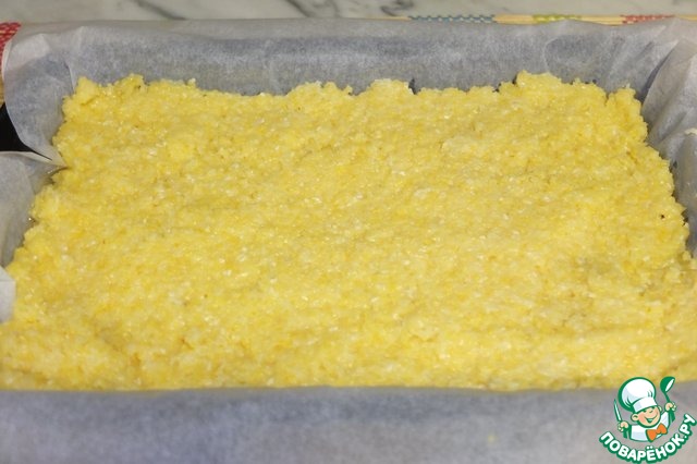 • Дно формы застилаем пекарской бумагой, выкладываем поленту, разравниваем. Остужаем при комнатной температуре и убираем в холодильник. Я делала поленту вечером, оставляла на ночь.