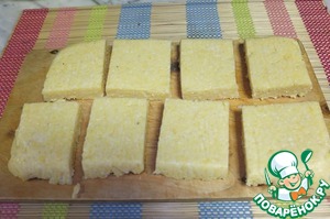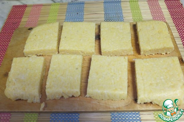 • Холодную поленту достаем из холодильника, вытаскиваем из формы и нарезаем на порционные куски.