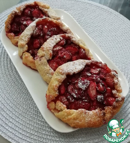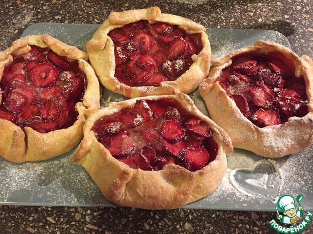 Достать тесто из холодильника. Разделить на 3-4 части и раскатать каждую часть в пласт толщиной 0.5-0.7 см. Затем аккуратно перенести на противень, застеленный пергаментной бумагой. В центр каждой галеты выложить клубнику, а сверху по 2-3 небольших кусочка масла.