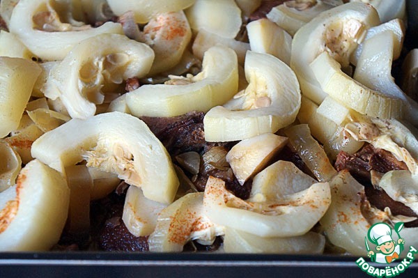 В противень влить стакан воды, накрыть крышкой и запекать в духовке при температуре 200 градусов примерно 1,5 часа.