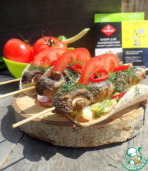 Замечательную закуску из грибов и овощей можно приготовить на природе. Для нее понадобятся нам лепешки для тако, острый овощной салат и маринованные шашлычки из шампиньонов.