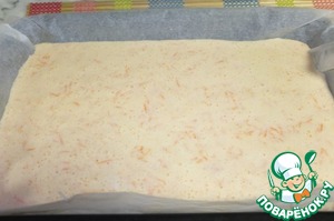 Выливаем тесто в форму застеленную пекарской бумагой. У меня форма 30*23 см.