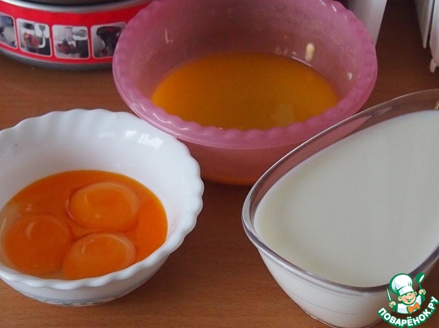 Итак, яйца разделить на желтки и белки. Белки взбить со щепоткой соли до тугих пиков. -