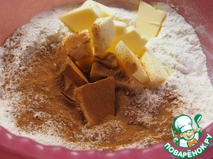 Приготовить посыпку. Масло, сахарную пудру, муку и корицу промять пальцами до образования крошки.
