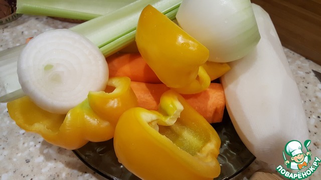 Добавить нарезанные лук, сельдерей и перец.
