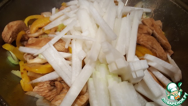 Добавить в сковороду дайкон, нарезанный соломкой.