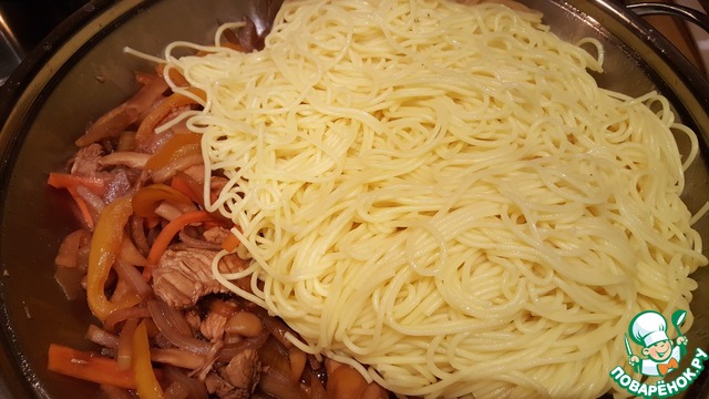 Смешать лапшу с содержимым сковороды, накрыть крышкой и дать постоять 5 минут. -