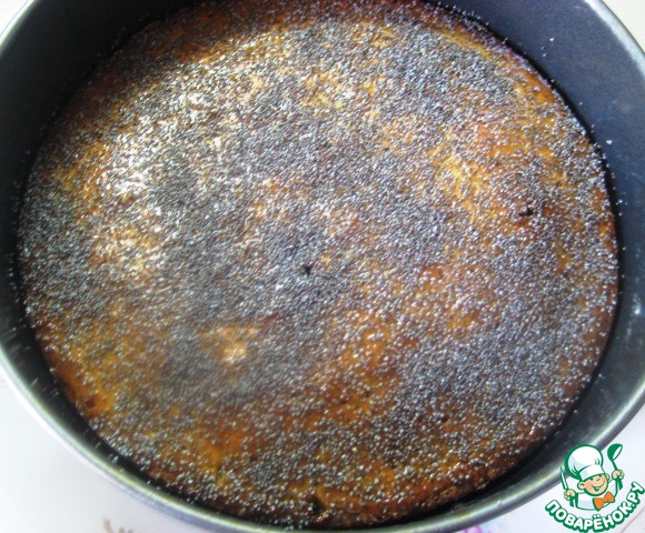 Когда пирог остынет можно его украсить. Пройтись кисточкой сиропом по поверхности пирога и присыпать маком, который сразу же прилипнет и не будет обсыпаться.