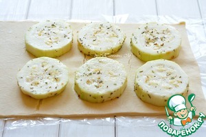 Разложить тесто на поверхности, на половину теста выложить кругляши кабачка с отступами -