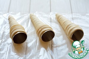 А вот и основа для второй закуски, обрезки накрутить на форму для трубочек (если таковой не имеется, можно накрутить на что-то другое жаропрочное, даже на маленькую жестяную баночку, хоть от паштета!)