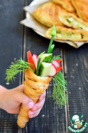 Получившиеся трубочки из теста можно начинить чем угодно, начиная от нежного гриль-мяса или рыбы, овощами или грибами! Я приготовила на скорую руку закуску для ребенка, начинив трубочки его любимыми овощами и чуть сбрызнув оливковым маслом