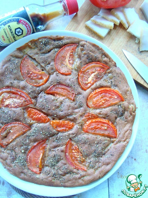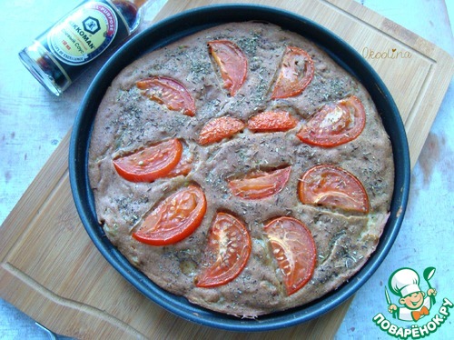 Ржаная лепёшка на мацони, с жареным луком, помидорами, тмином и прованскими травами. Без яиц. Вместо соли добавила соевый соус KIKKOMAN. Часто пеку подобные лепёшки. Это мне заменяет хлеб.