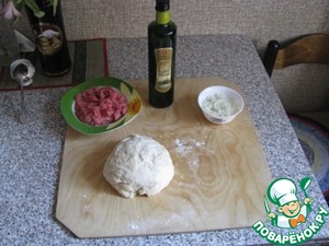 Подготовленные продукты: Просеянная мука, мелко порезанный лук, дрожжи, вода, соль, фарш ( у меня говяжий).