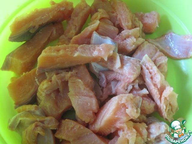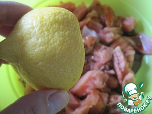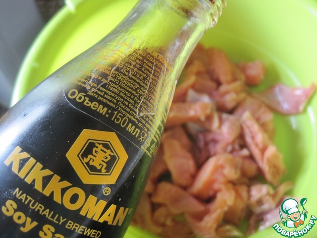 Филе горбуши нарезаем на кусочки, добавляем соевый соус.