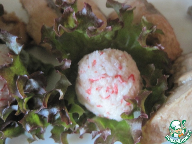 Крабовые шарики кладем на небольшие кусочки листьев салата и кладем рядом с рыбой рядами.