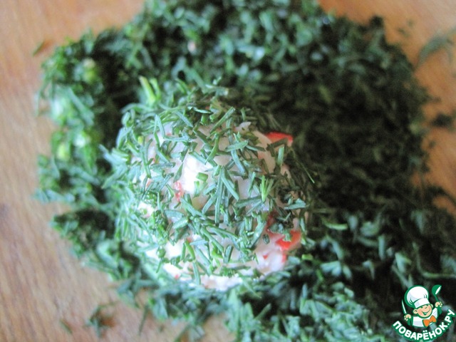 Еще ряд выкладываем из крабовых шариков, обваленных в измельченном укропе, и помидоры.