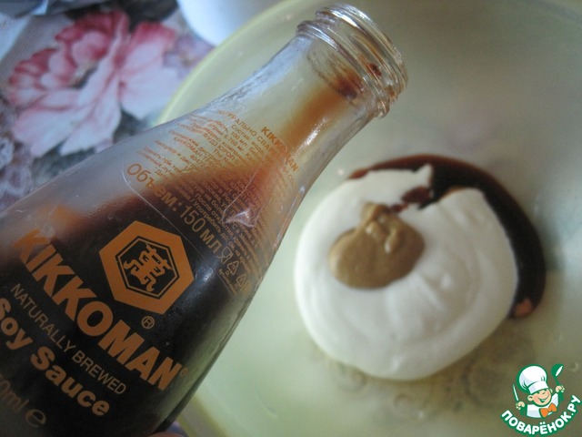 Заправляем сметаной смешанной с горчицей и соевым соусом.