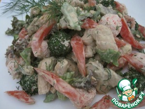 Салат с рыбой сочетает в себе необычный и интересный вкус, нежную текстуру и вкусную заправку. Шарики из крабовых палочек вызывают интерес в салате и хочется их попробовать в сочетании с овощами и рыбой.