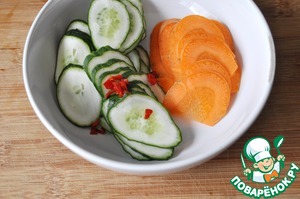 Сначала готовим маринованные овощи. Морковь и огурец режем очень тонкими кольцами или полукольцами, удобнее использовать тёрку "Бёрнера". Мелко режем перец чили или халапеньо (без семян).