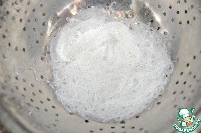 Готовим фунчозу согласно инструкции на упаковке. Я заливаю кипятком на 3 минуты. Далее откидываем на дуршлаг, промываем холодной водой, оставляем стечь.