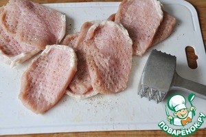 Свинину (карбонат) нарезаем кусками толщиной около 1,5 см, слегка отбываем, натираем солью и смесью перцев.