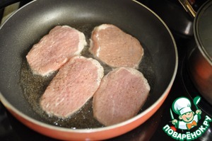 На горячую сковороду наливаем растительное масло, кладём свинину. Обжариваем мясо по 3-4 минуты с каждой стороны.