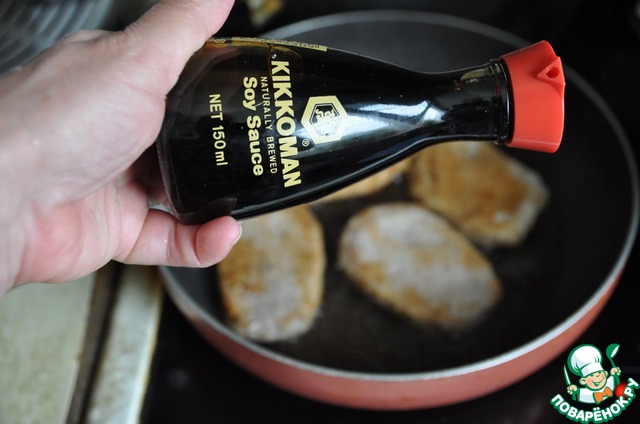 Поливаем мясо соевым соусом ТМ "Киккоман", переворачиваем и готовим в течение 30 сек.