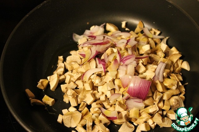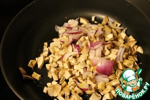 Готовим начинку № 1: Грибы мелко нарезать, добавить лук, обжарить с 2-мя ст. л. масла до слегка золотистого цвета. Посолить и поперчить.