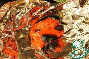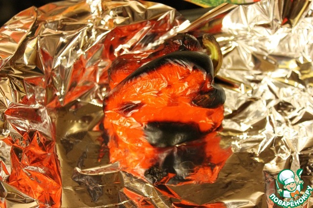 Перец запечь, до черных подпалин. Затем положить в пакет и оставить на пару минут, для того чтобы легче было снять кожицу.