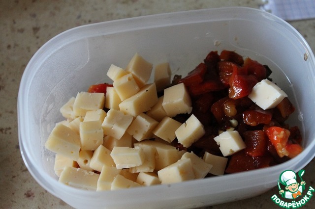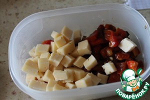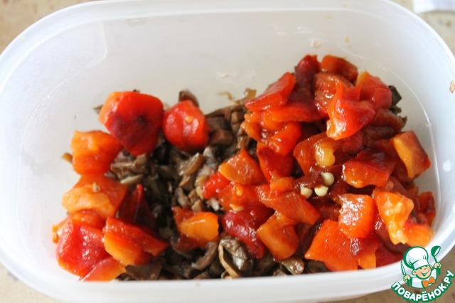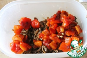 К обжаренным грибам добавить нарезанный кубиками запеченный перец.
