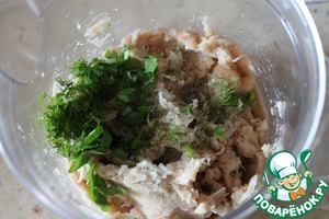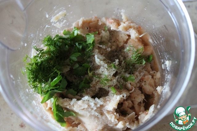 К фасолевому пюре добавить зелень и чеснок натертый на мелкой терке, посолить и поперчить по вкусу. Перемешать.