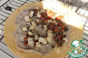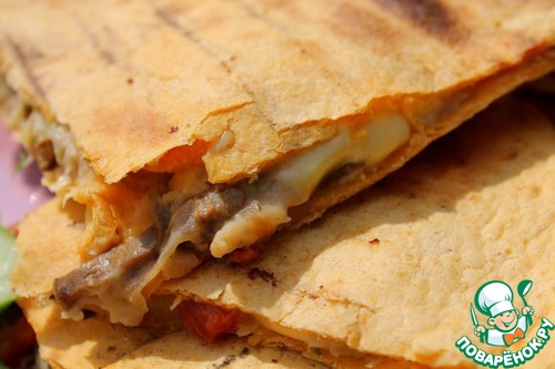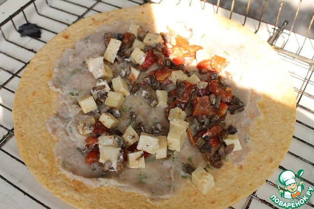 Поверх фасоли выложить равномерно Начинку № 2. Сверху накрыть второй лепешкой. Обжаривать на тлеющих углях 5 минут с двух сторон, часто переворачивая. Подавать в горячем виде! Приятного аппетита!
