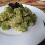 Пока лук жарится, нарезаем на мелкие кубики кабачки