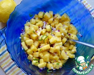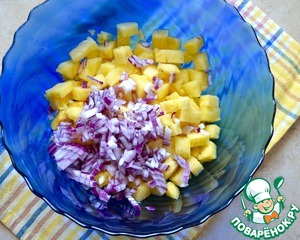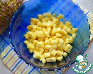 Первым делом приготовить ананасовую сальсу. Для этого небольшой свежий ананас очистить и нарезать мелкими кубиками.