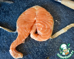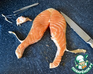 С помощью пинцета тщательно удалить все имеющиеся косточки поменьше. Острым ножом подрезать кожу с боков и отделить её от мясной части (примерно до половины стейка). -