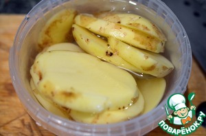 Картофель помыть, нарезать кружками, промыть, затем обсушить.