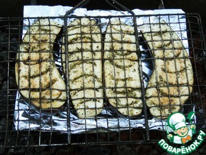 На решетку положить лист фольги, на него - половинки баклажанов шкуркой к фольге. Зафиксировать крышкой и обжаривать на углях 10-15 минут, переворачивая.