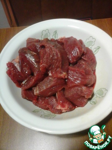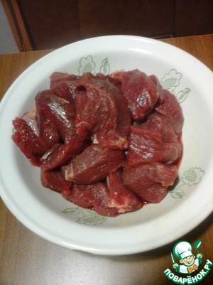 Мясо нарезать на кусочки толщиной не больше одного сантиметра. Если у вас не вырезка, его надо немного отбить.