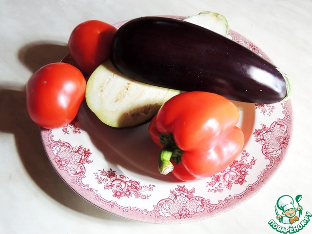 Приготовить овощи для запекания: перец и помидоры оставить целыми, баклажан разрезать вдоль пополам (если баклажаны небольшие, то не делать этого).