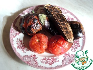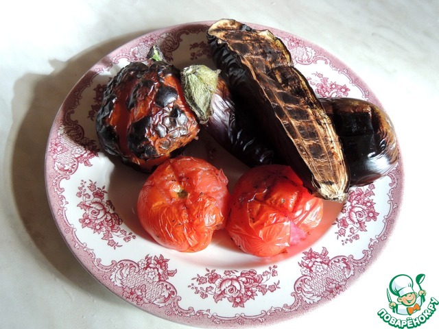 Запечь овощи на решетке на мангале. Сразу горячими очистить от шкурки (перец и от семян).