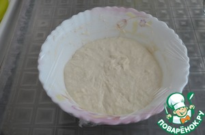 Перемешаем и закроем пленкой. Уберем в теплое место без сквозняков для подъема