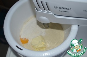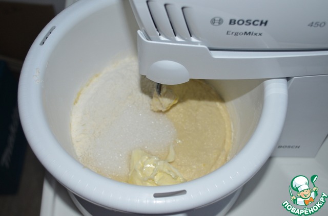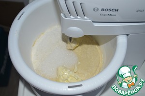 Добавим оставшееся масло (40 гр), половину сахара (50 гр), часть муки (около 30 гр), перемешиваем